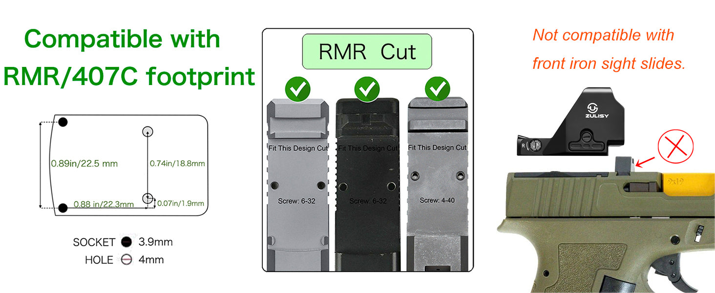 Note: The Zulisy OAK Plus Green Dot DOES NOT FIT Viper/Venom/Burris Fastfire/Doctor/RMSc/407k/507k/RMS/DPP footprints. (DOES NOT FIT MICRO COMPACT PISTOL)